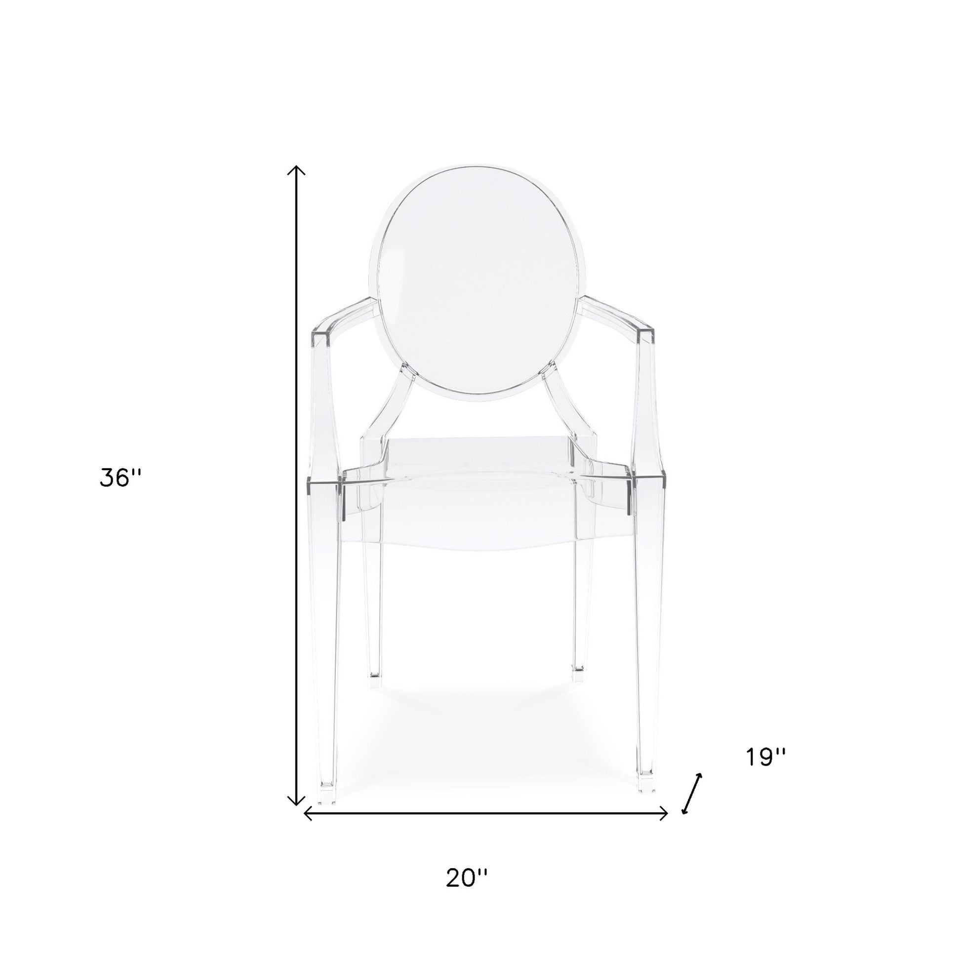 Make your dining room stand out with the clear acrylic king louis back dining arm chair. Complete with king louis back, this chair not only looks good but is comfortable. The chair is stackable, making it really convenient to store away if needed. Dining chairs are a great way to compliment your kitchen or dining room but can also be used in the foyer, hallway, or any room you might need extra seating. 36-inch H x 20-inch W x 19-inch D